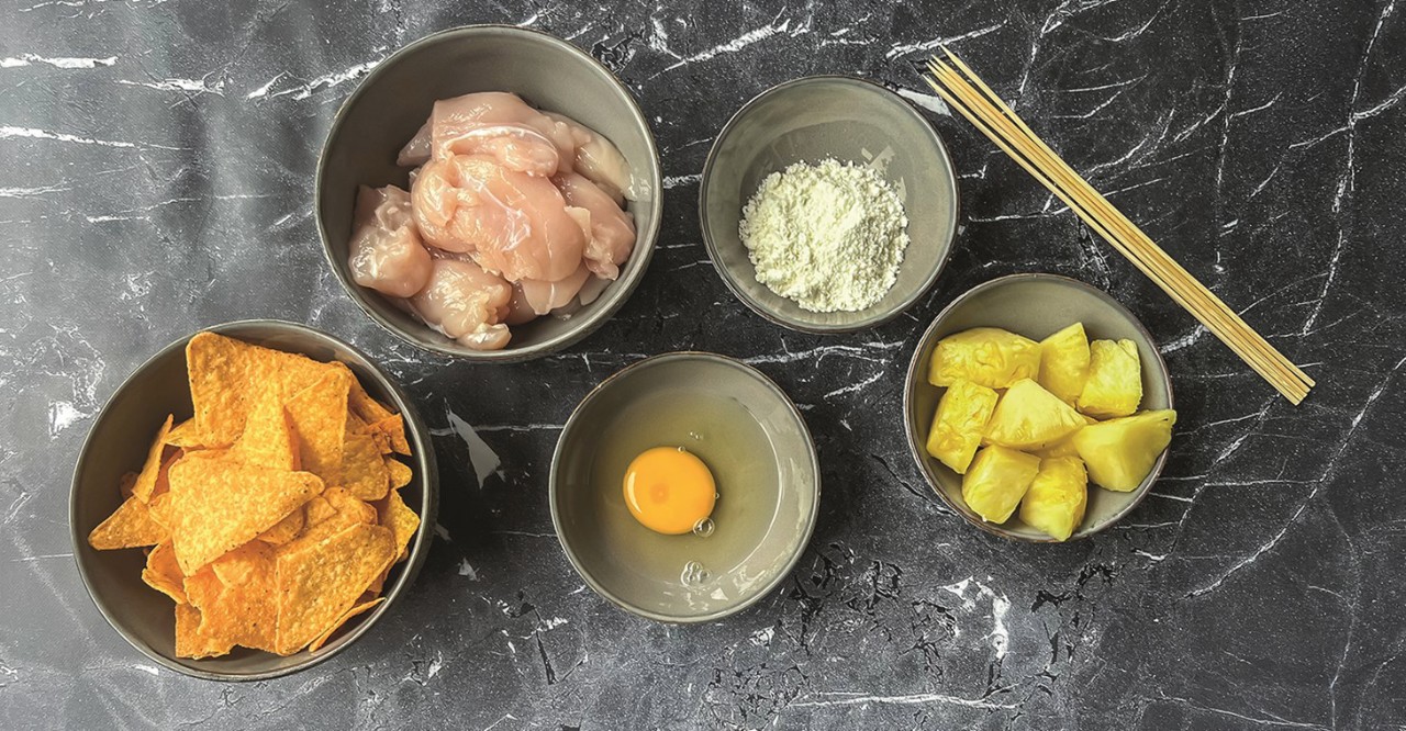 De kip door het meel, het ei en door het paneermeel van tortillachips rollen, is een leuk klusje om samen met cliënten te doen. Net als het rijgen van de satéprikkers. Die vieze handen was je daarna wel weer!