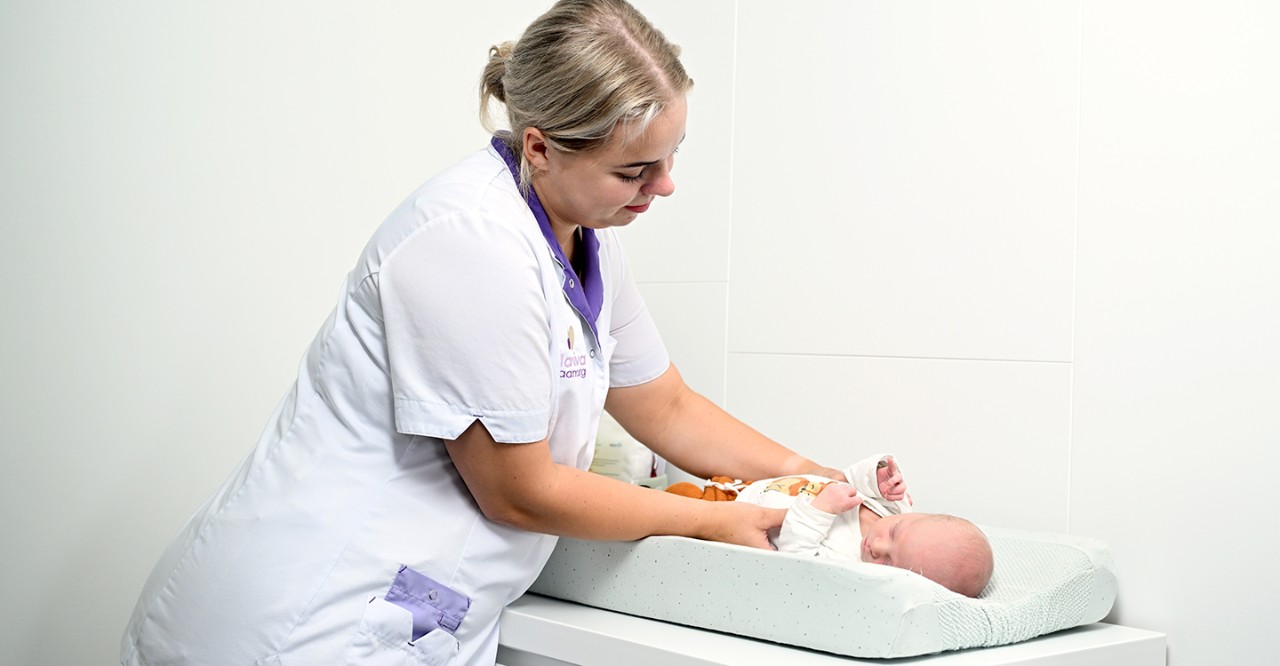 ‘Zorgen voor moeder en kind. Dat doe je ‒ normaal gesproken ‒ acht dagen achter elkaar bij de mensen thuis. Ik help bijvoorbeeld met de borstvoeding en het baden van het kindje, en ik houd de gezondheid van moeder en kind in de gaten. Ook monitor ik de groei van het kindje. Als iets niet in orde is, geef ik dat door aan de verloskundige, van wie ik zeg maar de oren en ogen ben. Daarnaast geeft een kraamverzorgende voortdurend voorlichting over de zorg voor het kindje. Want straks moeten ze het alleen redden.’