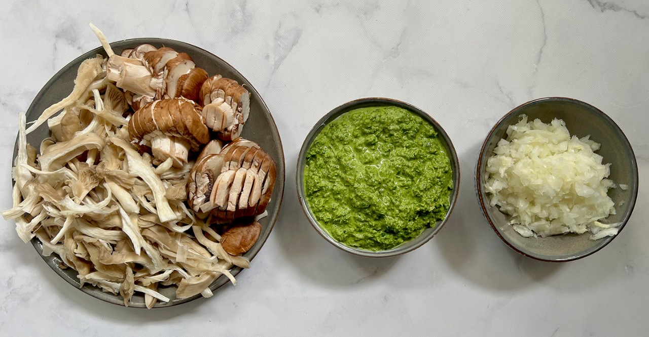 - Snijd de champignons in dunne plakjes en scheur de oesterzwammen in reepjes.