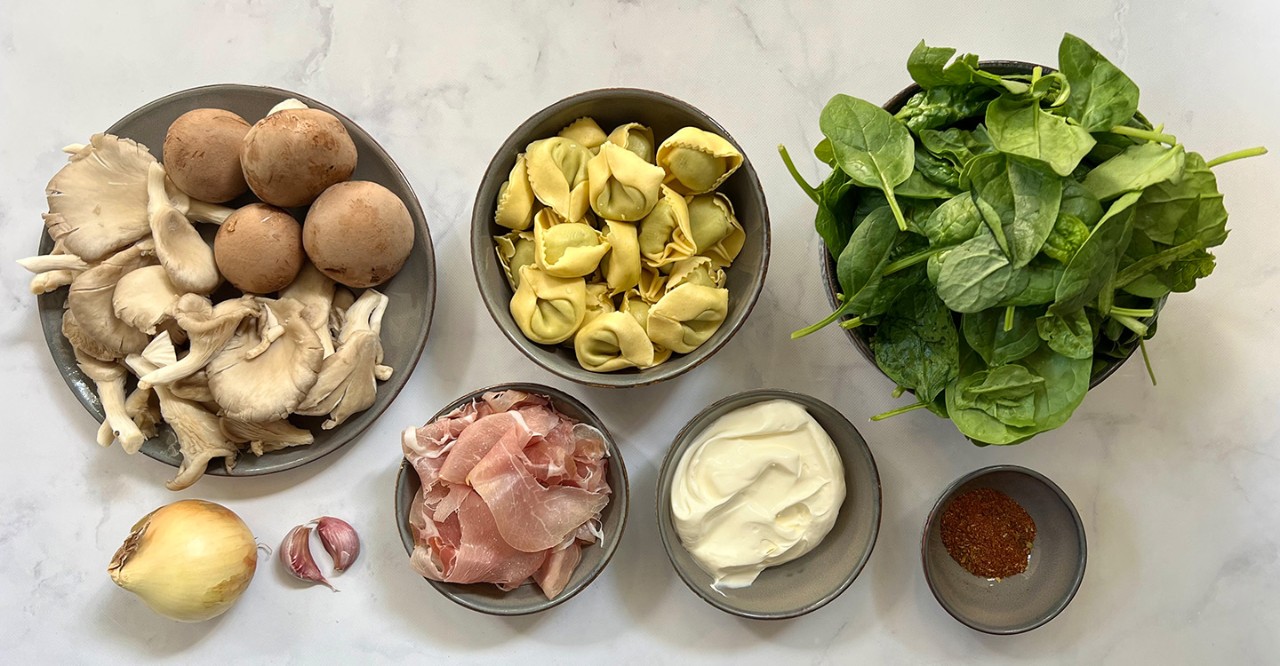 Paddenstoelen combineer je met spinazie en een beetje prosciutto crudo. Veelzijdig én gezond. Ze passen perfect bij de gevulde tortelloni, knapperige spinazie, zachte crème fraîche en het subtiele zoutige accent van rauwe ham.