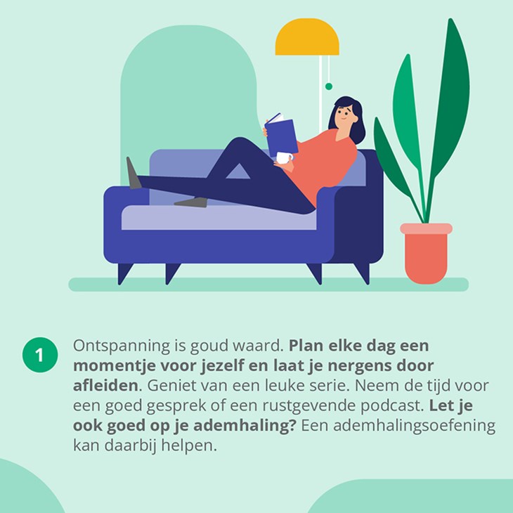 Ontspanning is goud waard. Plan elke dag een momentje voor jezelf en laat je nergens door afleiden. Geniet van een leuke serie. Neem de tijd voor een goed gesprek of een rustgevende podcast. Let je ook goed op je ademhaling? Een ademhalingsoefening kan daarbij helpen. De boxbreathing is een bijvoorbeeld een beproefde methode onder topsporters en speciale politie-eenheden.