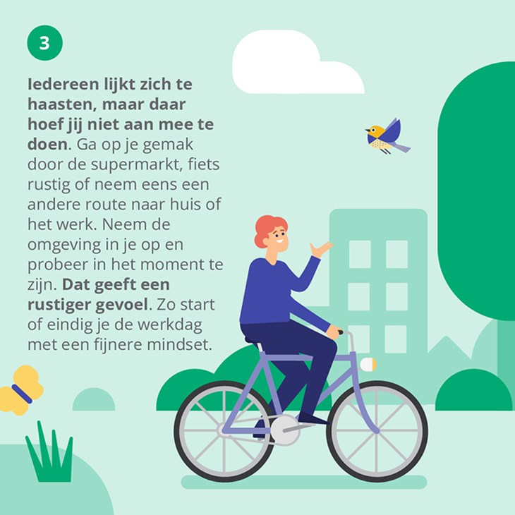 Iedereen lijkt zich te haasten, maar daar hoef jij niet aan mee te doen. Ga op je gemak door de supermarkt, fiets rustig of neem eens een andere route naar huis of het werk. Neem de omgeving in je op en probeer in het moment te zijn. Dat geeft een rustiger gevoel. Zo start of eindig je de werkdag met een fijnere mindset.
