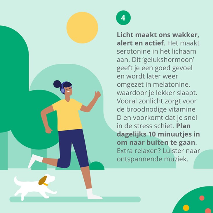 Licht maakt ons wakker, alert en actief. Het maakt serotonine in het lichaam aan. Dit ‘gelukshormoon’ geeft je een goed gevoel en wordt later weer omgezet in melatonine, waardoor je lekker slaapt. Vooral zonlicht zorgt voor de broodnodige vitamine D en voorkomt dat je snel in de stress schiet. Plan dagelijks 10 minuutjes in om naar buiten te gaan. Extra relaxen? Luister naar ontspannende muziek.