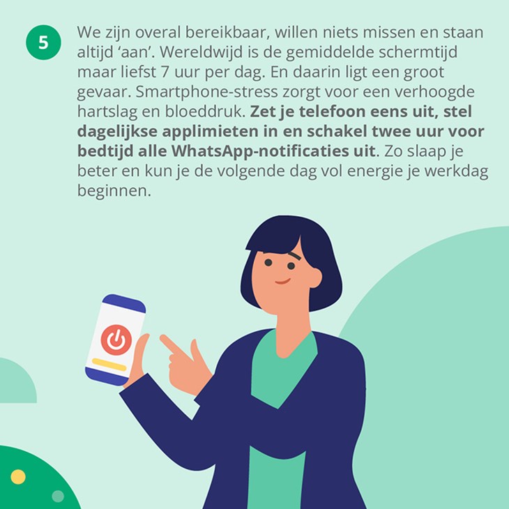 We zijn overal bereikbaar, willen niets missen en staan altijd ‘aan’. Wereldwijd is de gemiddelde schermtijd maar liefst 7 uur per dag. En daarin ligt een groot gevaar. Smartphone-stress zorgt voor een verhoogde hartslag en bloeddruk. Zet je telefoon eens uit, stel dagelijkse applimieten in en schakel twee uur voor bedtijd alle WhatsApp-notificaties uit. Zo slaap je beter en kun je de volgende dag vol energie je werkdag beginnen.