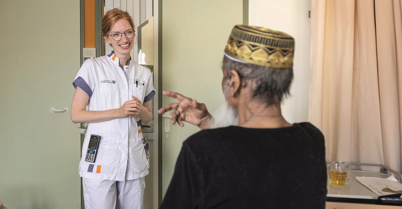 ‘Van oorsprong ben ik kok, ik werkte jarenlang in de horeca. Een groot deel van mijn schoonfamilie werkt in de zorg; door hen werd ik nieuwsgierig en besloot ik de overstap te maken. Maar zonder diploma in de zorg gaan werken, is lastig. In sollicitatiebrieven vertelde ik dat ik ervaring op wilde doen. Vaak werd ik afgewezen, maar een ouderenzorgorganisatie in Driebergen was enthousiast. Daar heb ik een jaar lang verzorgende IG’ers geholpen met cliënten wassen, aankleden en hen in en uit bed tillen. Daarna kon ik doorgroeien: ik volgde de opleiding tot verzorgende IG en medewerker maatschappelijke zorg, de verkorte opleiding tot verpleegkundige en nu hbo-verpleegkunde. Per week kost me dat ongeveer 24 uur thuissstudie – naast 16 uur werken en één dag school.’