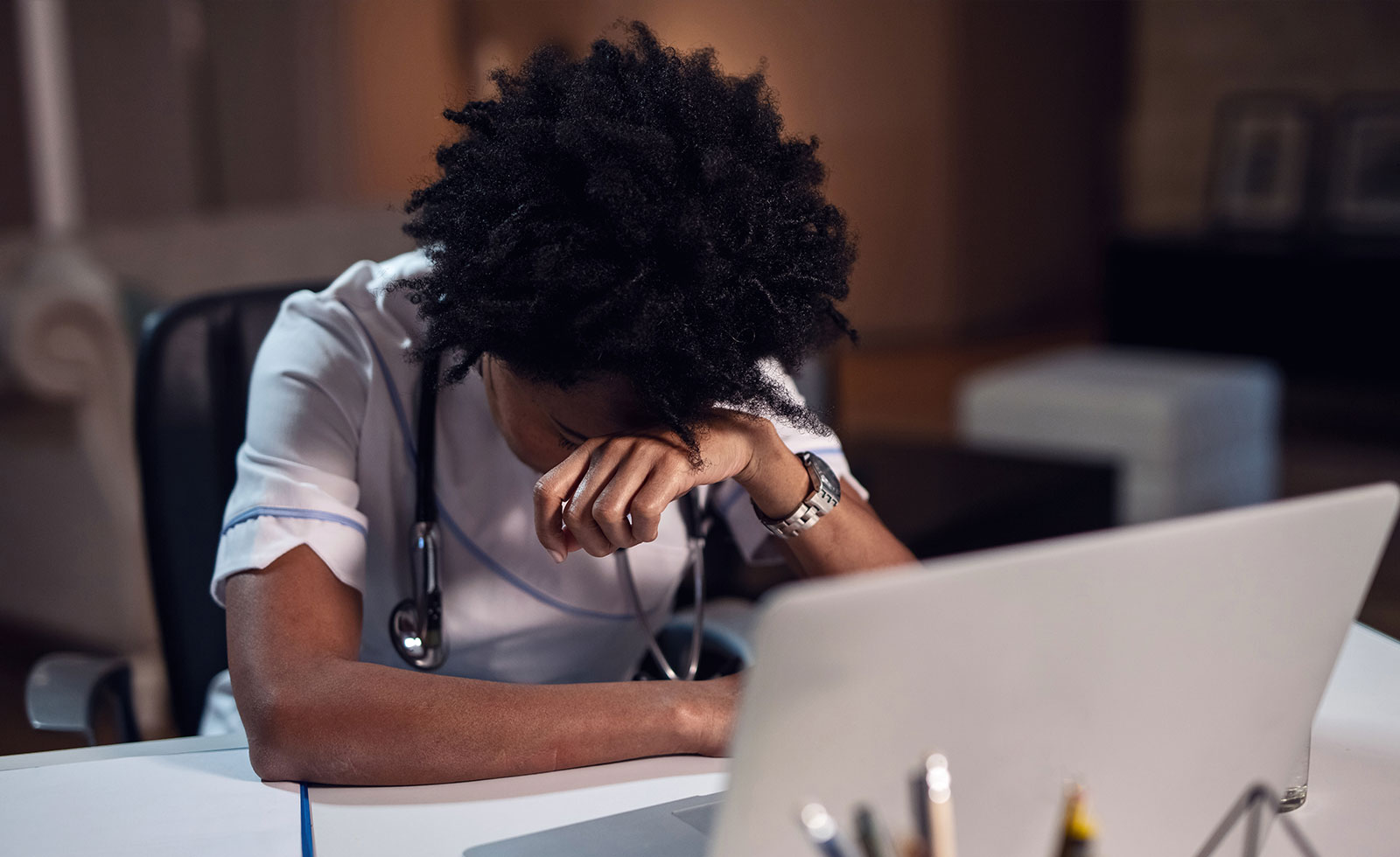 Maar stress heeft ook invloed op je brein: het kan niet meer tot rust komen. Als je eenmaal ‘aan’ staat, ben je minder goed in staat om helder na te denken. Onder spanning en stress zie je eigenlijk alleen maar wat er nodig is om door te gaan, te ‘overleven’ en goed voor patiënten en cliënten te blijven zorgen. Ondertussen verdwijnt jouw eigen welzijn steeds verder naar de achtergrond.'