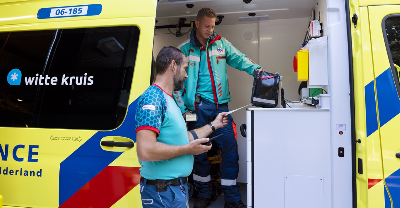 ‘Ter plaatse beoordelen we samen of de situatie 'zorgelijk' is of niet. Dat bepaalt het werktempo. De chauffeur doet de assisterende zorgtaken, zoals de monitor aansluiten, eventuele plakkers op de borst plakken, bloeddruk en zuurstofniveau meten. De verpleegkundige verleent de medische zorg, denk aan intubatie, infuus aanbrengen en de waarden van de metingen interpreteren. Onderweg naar het ziekenhuis zorgt de verpleegkundige voor de patiënt en communiceer ik met de meldkamer.’