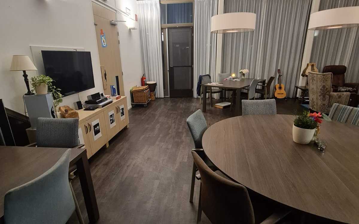 De cliënten hebben zich even zelf vermaakt, maar rond dit tijdstip komen we altijd weer samen in de woonkamer om koffie te drinken. Sommigen gaan lezen, kijken tv of pakken er een kleurboek bij. Om de interactie en ‘samen spelen’ te stimuleren, doen we een spelletje. De tovertafel gaat aan, waarmee spelletjes op de tafel verschijnen via een projector die aan het plafond hangt. We gaan ook weleens sjoelen of doen aan karaoke.