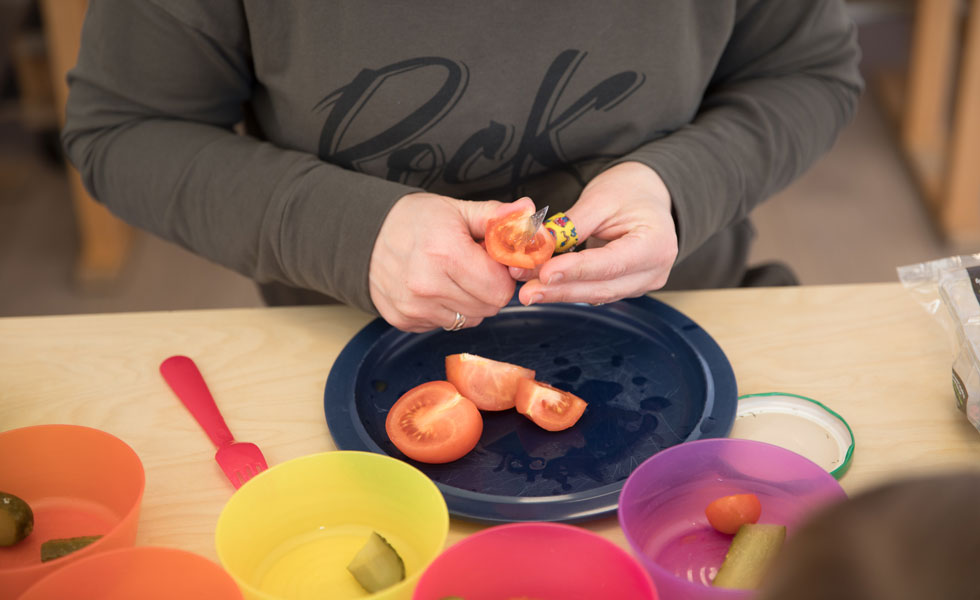 Miranda Bron (42) is coördinator bij kindcentrum Het Baken in Amersfoort én een bevlogen ambassadeur voor Gezonde Kinderopvang. In die laatste rol geeft ze, net als Ilse, voorlichting en training aan kinderdagverblijven over een gezond leefstijlbeleid. Natuurlijk brengt ze dit zelf dagelijks in de praktijk op haar eigen kindcentrum. 'We hebben op Het Baken een voedingsbeleid, gebaseerd op de schijf van 5. Variatie staat voorop.