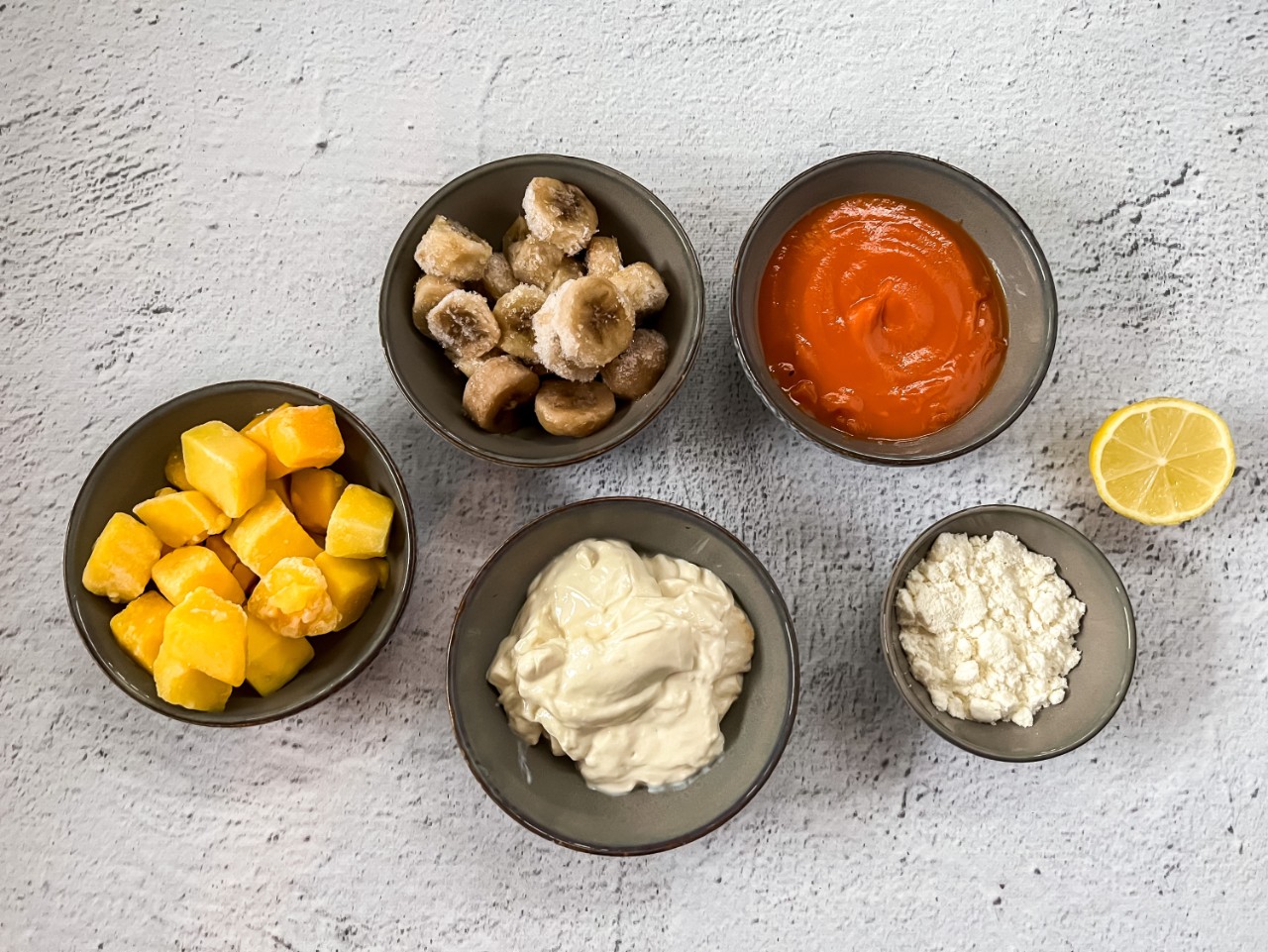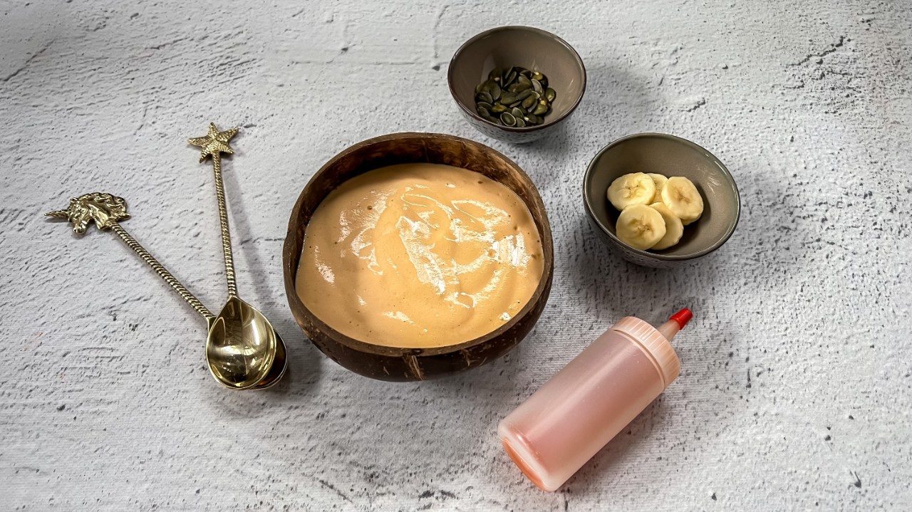Toppings: 25 gram pompoenpuree, een halve banaan in plakjes en pompoenpitten
