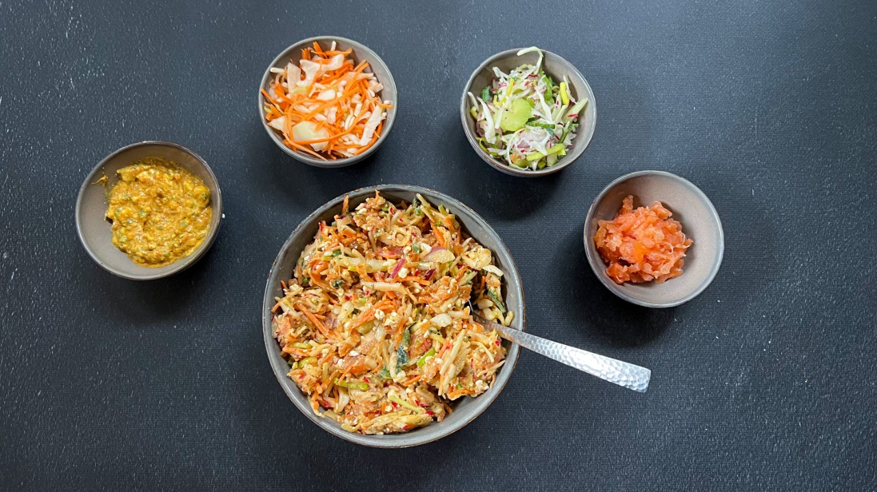 Als je meer dan twee boterhammen eet, kun je de hoeveelheid rauwkost natuurlijk makkelijk aanpassen. Met de combinatie van de koolhydraten in het brood en de eiwitten in de zalm of kip kun je na de lunch weer vol energie aan het werk!