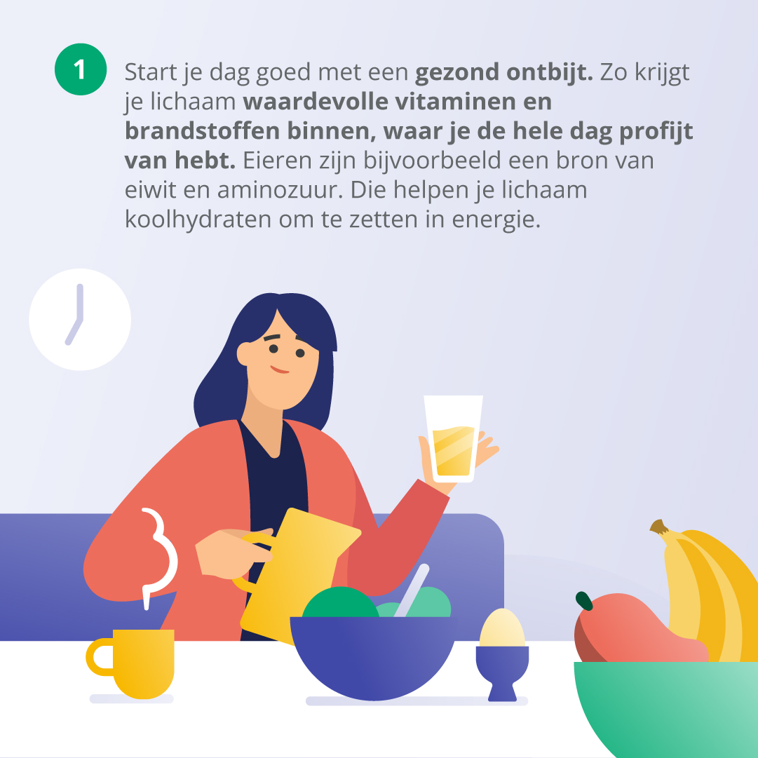 Start je dag goed met een gezond ontbijt. Zo krijgt je lichaam waardevolle vitaminen en brandstoffen binnen, waar je de hele dag profijt van hebt. Eieren zijn bijvoorbeeld een bron van eiwit en aminozuur. Die helpen je lichaam koolhydraten om te zetten in energie. Weinig tijd in de ochtend? Maak de avond van tevoren overnight oats. Door het weken zijn de vezels makkelijker verteerbaar, waardoor je lichaam de voedingsstoffen beter opneemt. Verpleegkundige en eetliefhebber Nienke heeft hier een lekker recept voor.