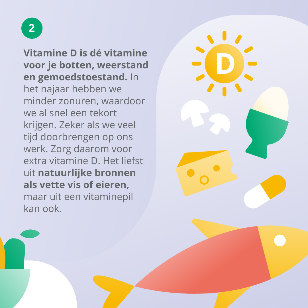 Vitamine D is dé vitamine voor je botten, weerstand en gemoedstoestand. In het najaar hebben we minder zonuren, waardoor we al snel een tekort krijgen. Zeker als we veel tijd doorbrengen op ons werk. Zorg daarom voor extra vitamine D. Het liefst uit natuurlijke bronnen als vette vis of eieren, maar uit een vitaminepil kan ook.
