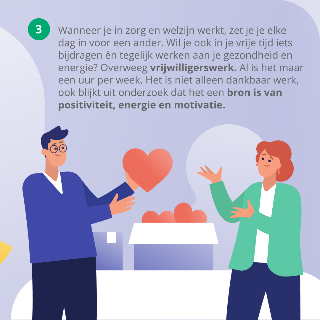 Wanneer je in zorg en welzijn werkt, zet je je elke dag in voor een ander. Wil je ook in je vrije tijd iets bijdragen én tegelijk werken aan je gezondheid en energie? Overweeg vrijwilligerswerk. Al is het maar een uur per week. Naast dat het werk dankbaar is, blijkt uit onderzoek dat het een bron is van positiviteit, energie en motivatie.