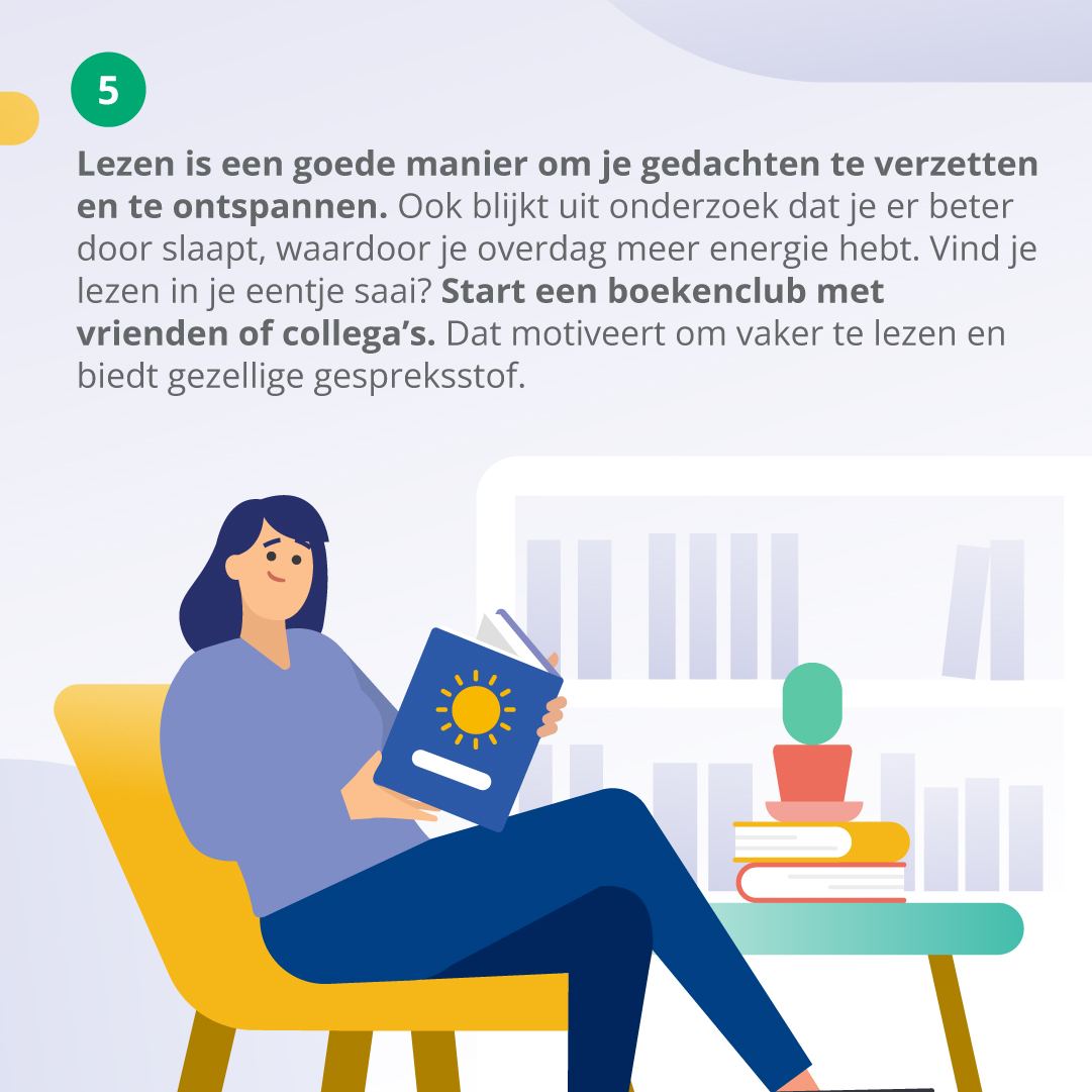 Lezen is een goede manier om je gedachten te verzetten en te ontspannen. Ook blijkt uit onderzoek dat je er beter door slaapt, waardoor je overdag meer energie hebt. Vind je lezen in je eentje saai? Start een boekenclub met vrienden of collega’s. Dat motiveert om vaker te lezen en biedt gezellige gespreksstof.