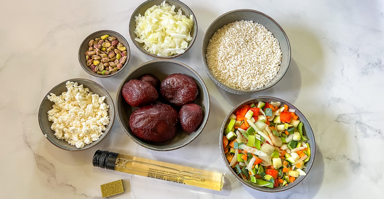 Heb je een tijd geleden één keer risotto gemaakt, waardoor er nog een aangebroken pak in de voorraadkast staat? Probeer dan deze risotto van rode biet. De hartige feta en pistachenootjes passen heel goed bij de zoete smaak van de bieten.