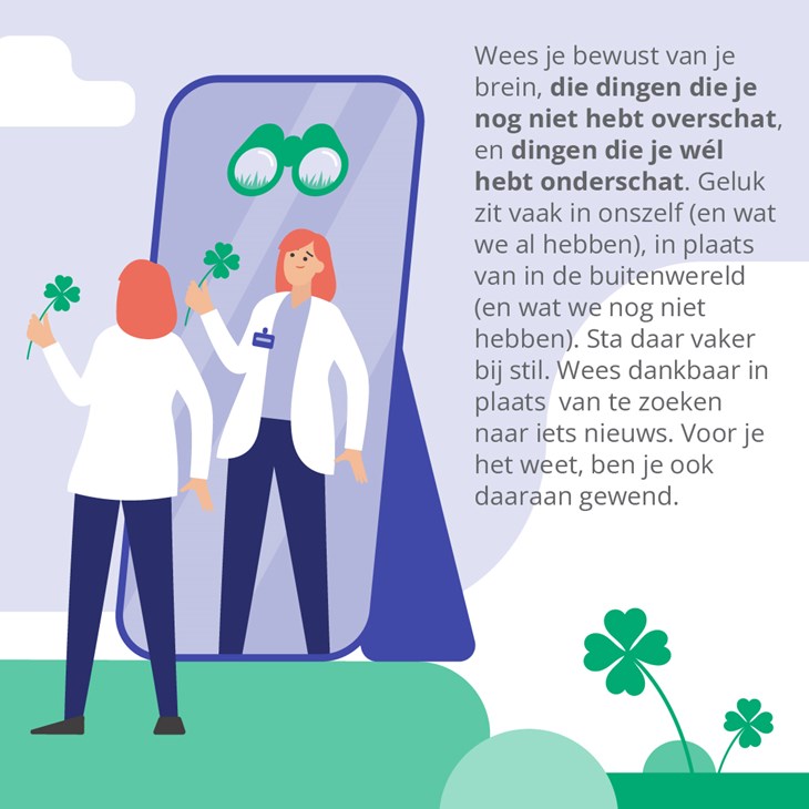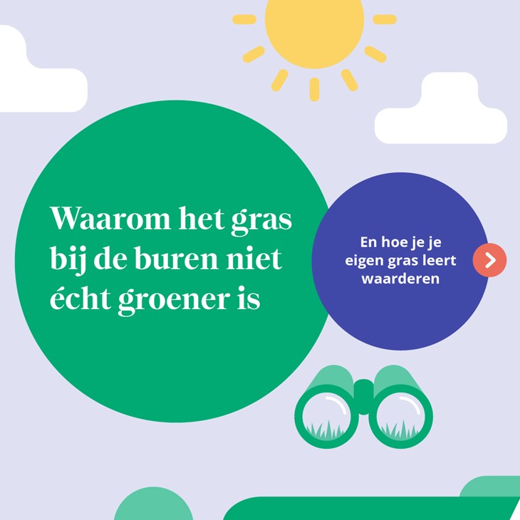 We zeggen weleens dat het gras bij de buren (of aan de overkant) groener is. Als we hebben wat een ander heeft, zullen we gelukkig zijn. Denken we. Maar geluk zit niet in de buitenwereld, het zit in je binnenwereld. Daarom is het de kunst om ons ‘eigen gras’ meer te gaan waarderen. Maar hoe doe je dat?