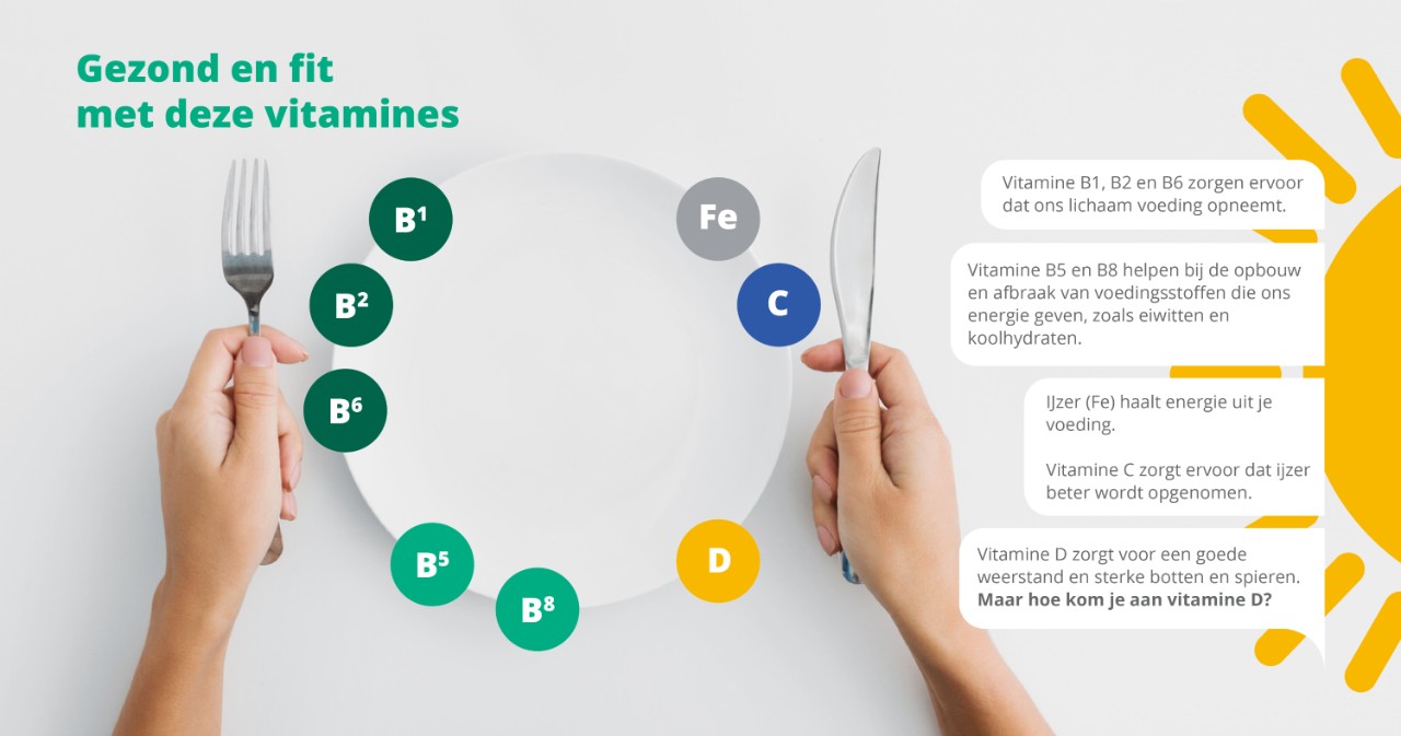 Ons lichaam kan zelf geen (of niet genoeg) vitamines aanmaken. Daarom is het belangrijk om gezond en gevarieerd te eten. Zo krijgen we genoeg voedingsstoffen binnen die we nodig hebben om te groeien, ontwikkelen en gezond te blijven.