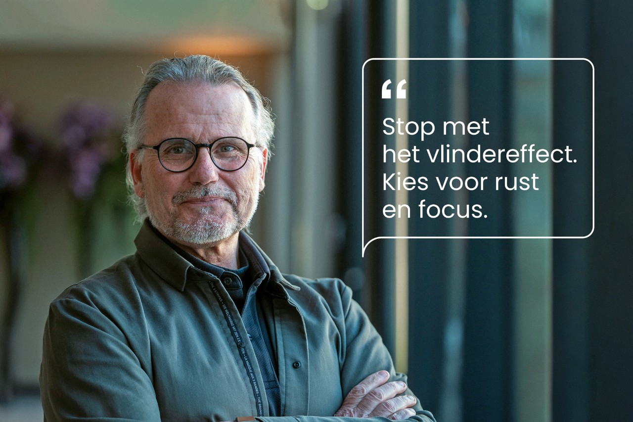 Zijn boodschap aan bestuurders is duidelijk: kies voor rust en focus. ‘Stop met fladderen van de ene bloem naar de andere. We hollen telkens achter de volgende hype aan – nu is dat AI – terwijl de basis nog niet op orde is. Het fatsoenlijk delen van informatie tussen zorginstellingen hebben we bijvoorbeeld nog steeds niet geregeld. Een beetje rust daarin brengen vind ik ook een taak voor bestuurders.’